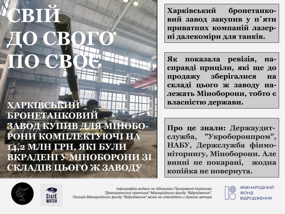 На складі бронетанкового заводу зберігалися комплектуючі для військової техніки, які належали Міністерству оборони. Про те, як халатно чиновники в погонах відносилися до державного майна, говорить ось такий уривок із акту аудиторів: "Договорів щодо відповідального зберігання техніки міністерства оборони не укладено. Внаслідок неукладання договорів державним підприємством "ХБТЗ" понесено витрати, які не відшкодовані міністерством, на суму 1,9 млн грн".