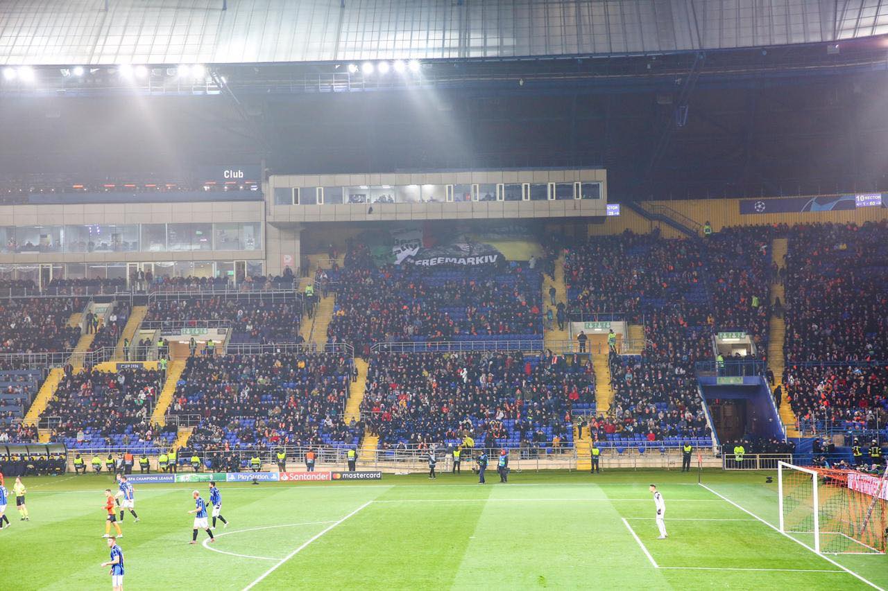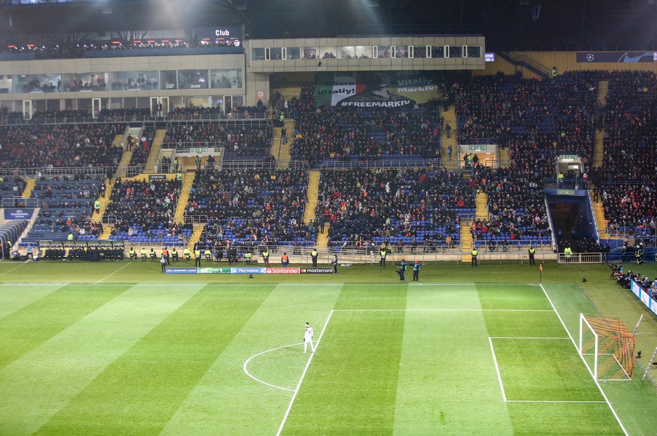 На мачте Лиги чемпионов "Шахтера" с итальянской "Аталантой" украинские болельщики развернули на центральной трибуне огромный баннер "L Italia, libera Vitaliy! #FreeMarkiv" – "Италия, освободи Виталия Маркива!"