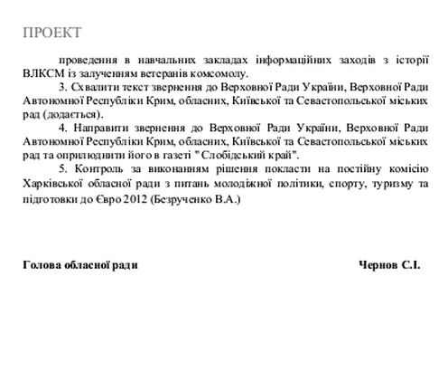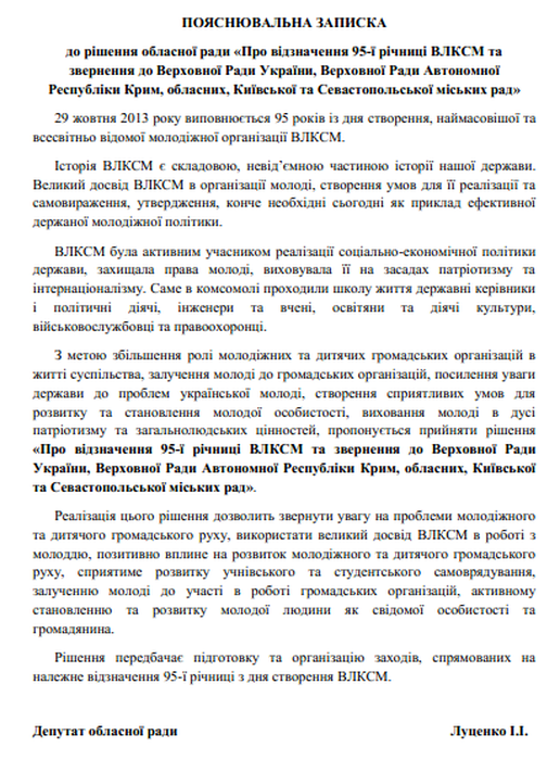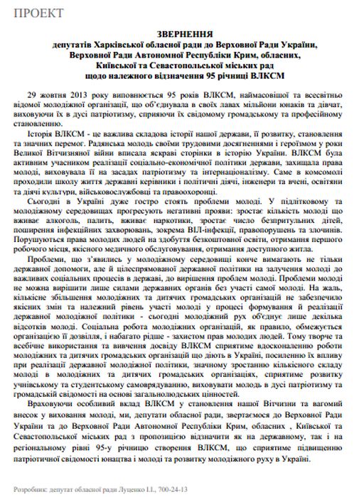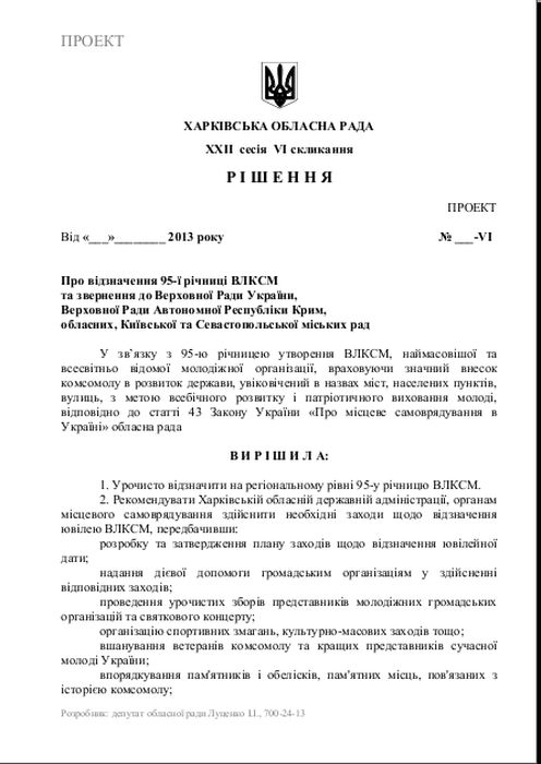 На последней сессии Харьковского облсовета депутаты приняли решение торжественно отметить 95-ю годовщину основания комсомольского движения. Я уже молчу о том, как это соотносится с устремлениями Украины интегрироваться в Европу, (где коммунистическая идеология приравнена к фашистской), но возникает резонный вопрос, а на каком основании за бюджетные деньги должны проводиться праздничные акции, концерты и лекции по истории ВЛКСМ в учебных заведениях?