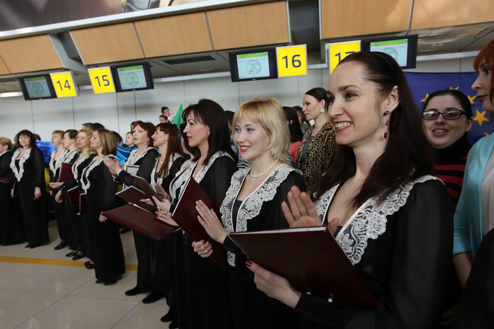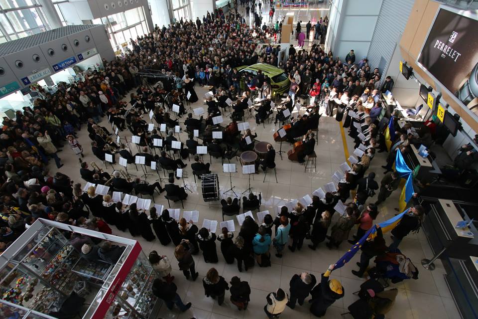 Солісти Олена Старикова, Лілія Кутищева, Олександр Лапіе, Олексій Срібницький. У цей день симфонія також прозвучала в аеропортах Києва, Одеси, Львова, Дніпропетровська, Дронецька. Мета акції – вшанування пам'яті Небесної сотні (сьогодні сороковий день загибелі), підтримка єдності України та підписання асоціації з Європейским Союзом, гімном якого є Ода до радості.До речі, цю симфорнію хор і оркестр виконали вперше рік тому на Дні Європи.