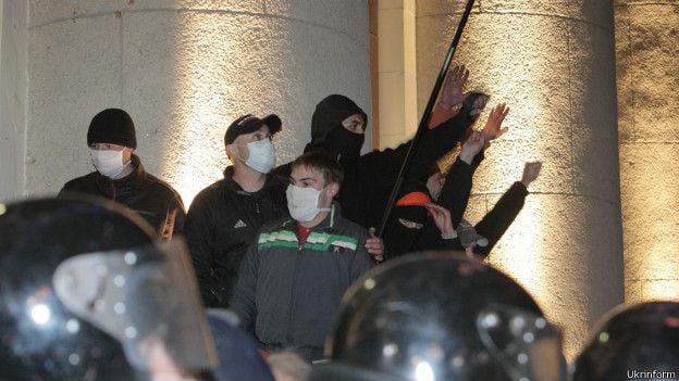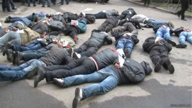 Вони наполягають: протягом усього протесту активісти чудово знаходили спільну мову з міліцією. Водночас, штурмувальники в масках були підкреслено агресивними. Один з курсантів Академії внутрішніх військ отримав у тій сутичці важке поранення: молодик у масці засунув йому шумову гранату під бронежилет.