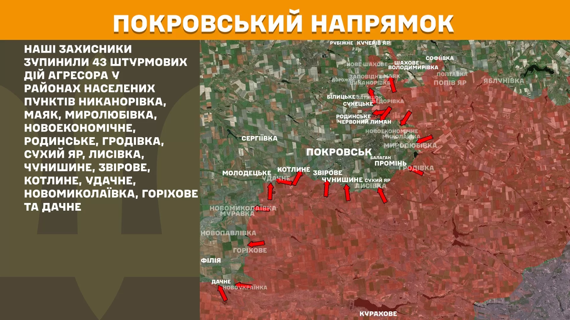 In the Pokrovsky direction, Ukrainian defenders stopped 43 assault actions of the aggressor in the areas of the settlements of Nykanorivka, Mayak, Myrolyubivka, Novoekonomichne, Rodynske, Grodivka, Sukhyi Yar, Lysivka, Chunyshyne, Zvirovo, Kotlyne, Udachne, Novomykolaivka, Horikhove and Dachne.
