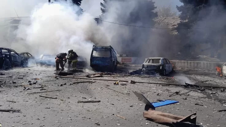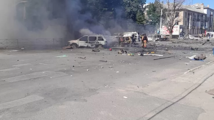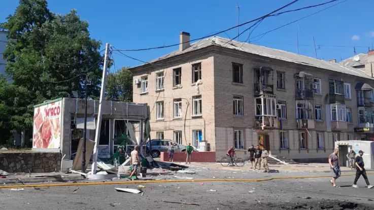 Vadym Filashkin, head of the Donetsk Regional Military Administration, confirmed the drone strike damaged two residential buildings, a market, a shop, and an administrative building, and destroyed several cars. Emergency services are currently working at the scene.