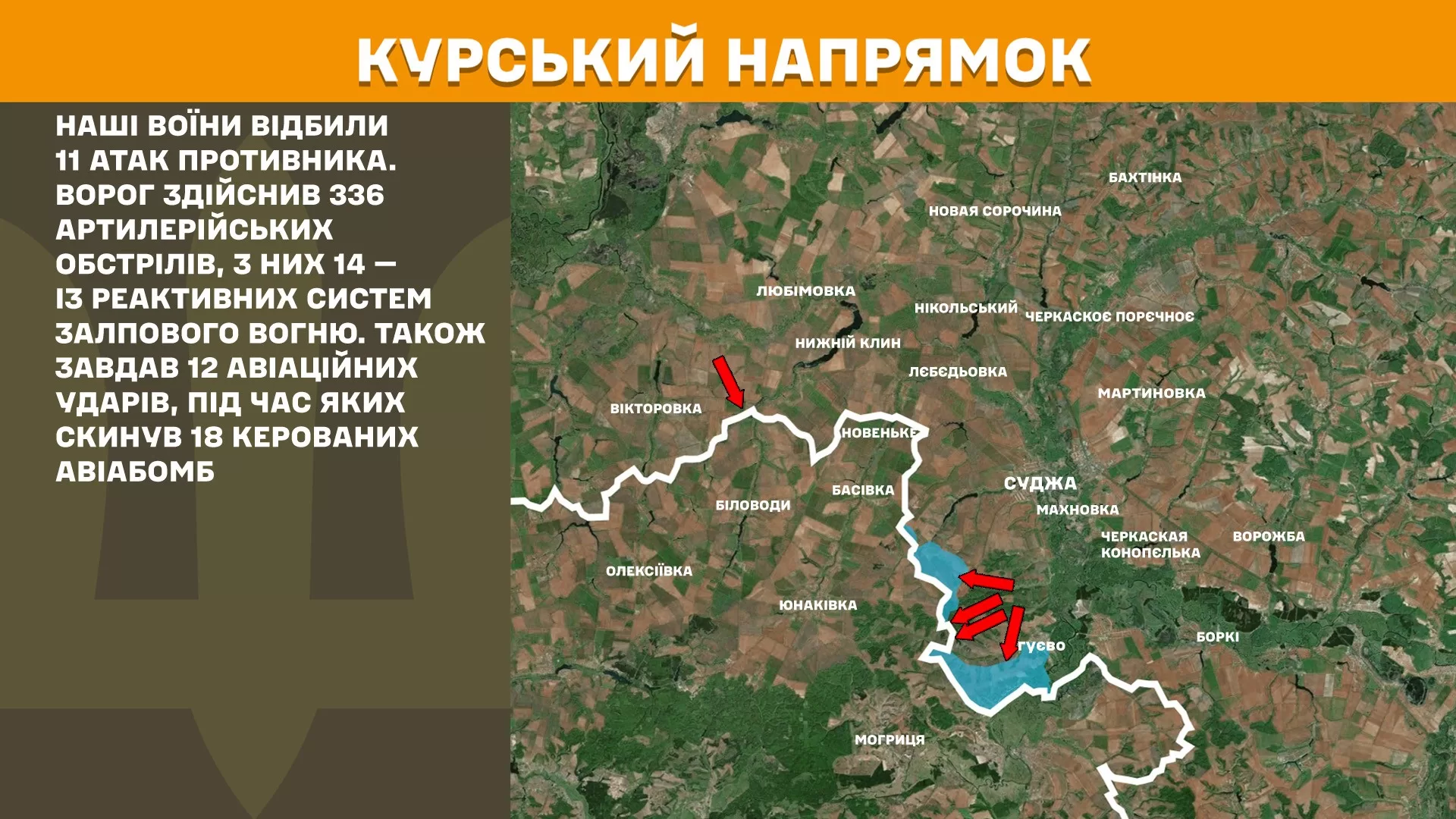 In the Kursk direction, the Armed Forces of Ukraine repelled 11 enemy attacks over the past day. The enemy carried out 336 artillery strikes, 14 of which were from multiple launch rocket systems. It also carried out 12 air strikes, during which it dropped 18 guided bombs.