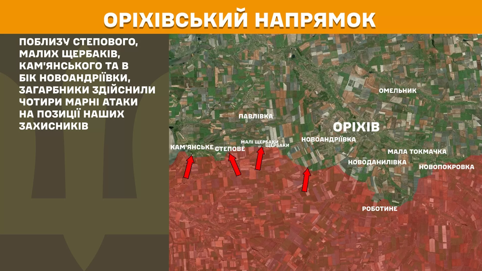 In the Orikhiv direction, near Stepove, Malykh Shcherbakiv, Kam’yanske, and in the direction of Novoandriivka, the invaders carried out four futile attacks on the positions of Ukrainian defenders.