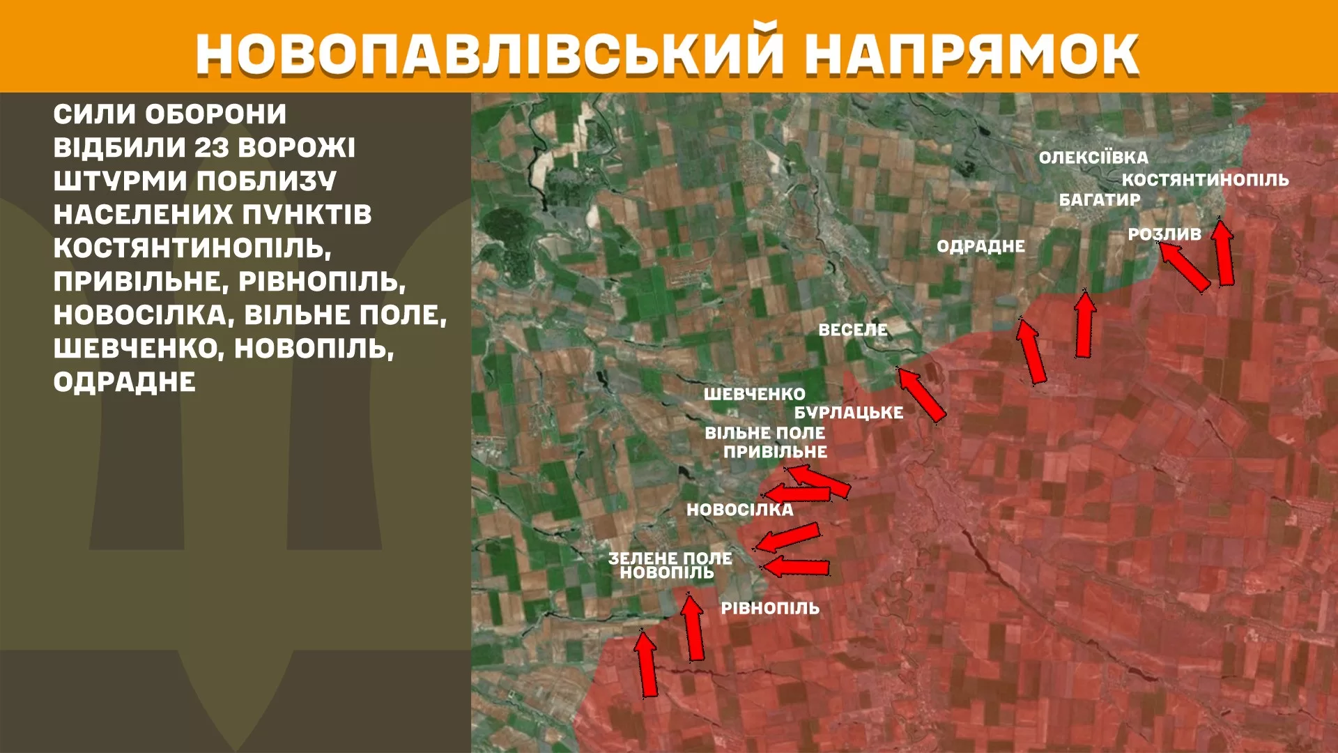In the Novopavlivka direction, the Defense Forces repelled 23 enemy assaults near the settlements of Kostyantynopil, Pryvillia, Rivnopil, Novosilka, Vilne Pole, Shevchenko, Novopil, and Odradne.