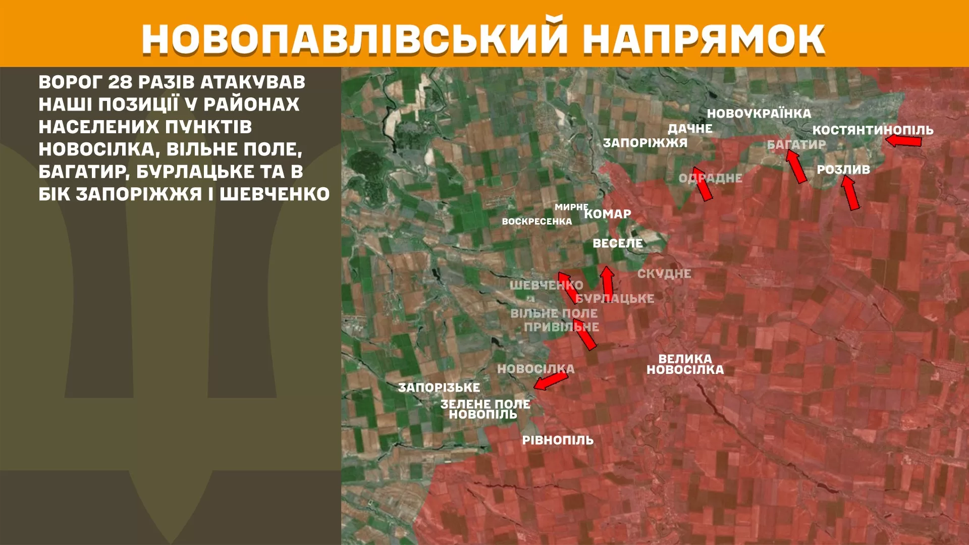 In the Novopavlivka direction, the enemy attacked the positions of the Armed Forces of Ukraine 28 times in the areas of the settlements of Novosilka, Vilne Pole, Bahatyr, Burlatsk, and in the direction of Zaporizhzhia and Shevchenko.
