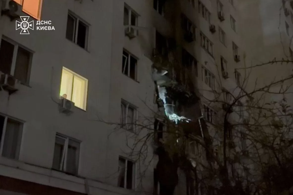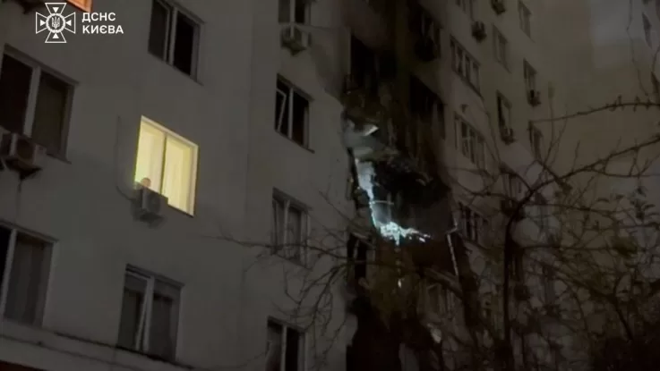 In the Shevchenkivskyi district, a 14-storey residential building was damaged, with apartments burning on the fourth and fifth floors. The fire was extinguished and medics assisted one person. In the Solomianskyi district, debris fell on a 25-storey building, igniting external insulation and partially destroying the facade from the first to the third floor. Parked cars were also damaged. The fire was put out and three people received medical assistance. At another address, debris hit a 17-storey building without causing a fire. In a private sector area, debris struck a garage; firefighters are still extinguishing the blaze.