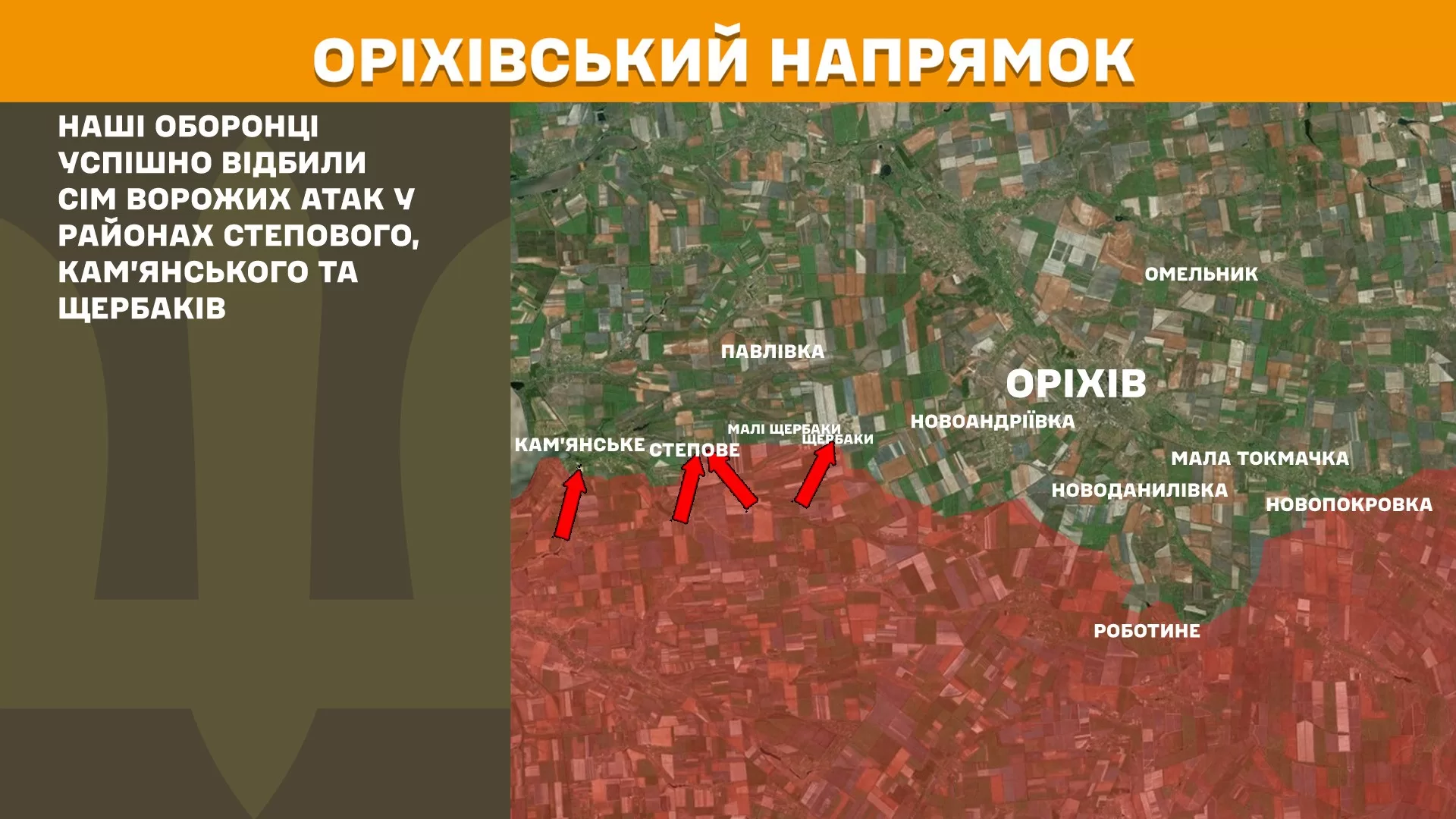 In the Orikhiv direction, Ukrainian defenders successfully repelled seven enemy attacks in the areas of Stepove, Kam’yanske, and Shcherbakiv.
