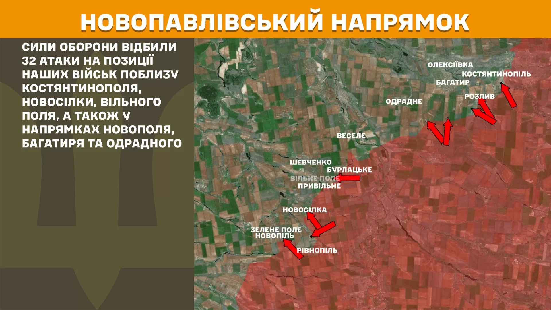 In the Novopavlivka direction, defense forces repelled 32 attacks on Ukrainian troops’ positions near Konstantynopil, Novosilka, Vilne Pole, as well as in the directions of Novopol, Bagatyr, and Odrne.