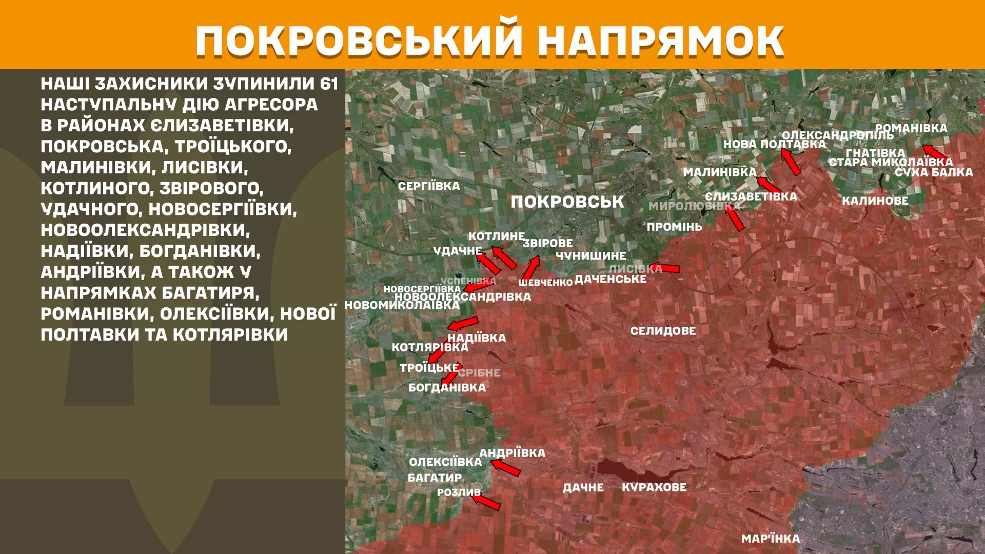 In the Pokrovsk direction, Ukrainian defenders stopped 61 offensive actions by the aggressor in the areas of Yelizavetivka, Pokrovsk, Troitske, Malynivka, Lysivka, Kotlyne, Zvirovo, Udachne, Novoserhiivka, Novooleksandrivka, Nadiivka, Bohdanivka, Andriivka, as well as in the directions of Bahatyr, Romanivka, Oleksiivka, Nova Poltavka, and Kotlyarivka.