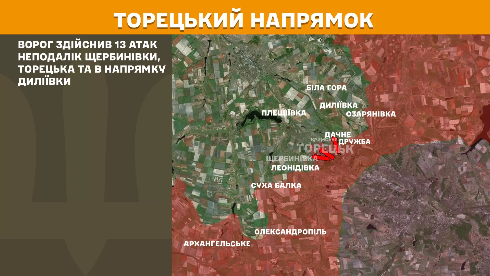 In the Toretsk direction, the enemy carried out 13 attacks near Shcherbinivka, Toretsk, and in the direction of Diliivka.