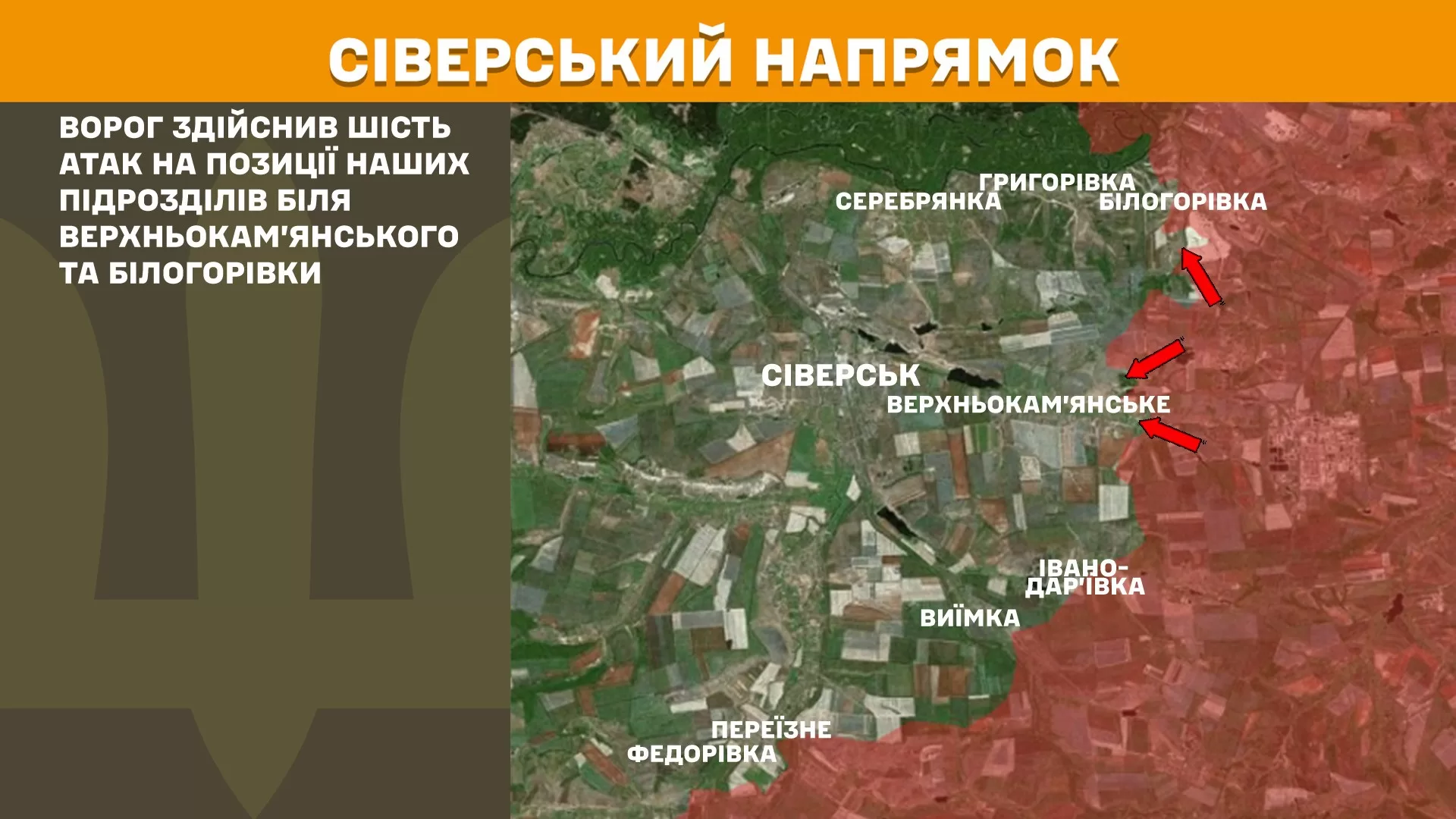 In the Siverskyi direction, the enemy carried out six attacks on the positions of the Armed Forces of Ukraine near Verkhniokam’yanske and Bilohorivka during the day.