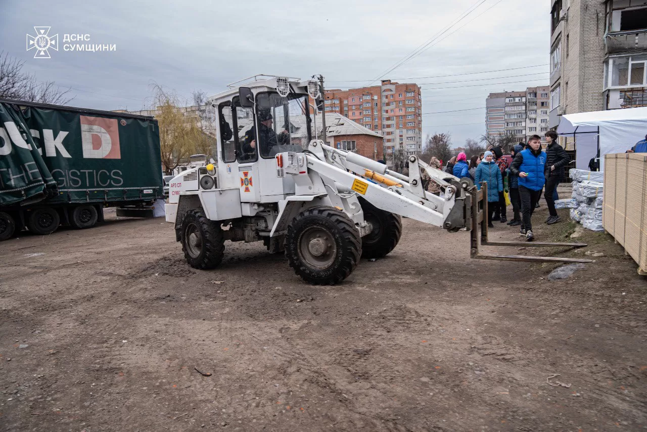 Emergency and restoration work at the impact site is ongoing. Special equipment is being used to unload construction materials.