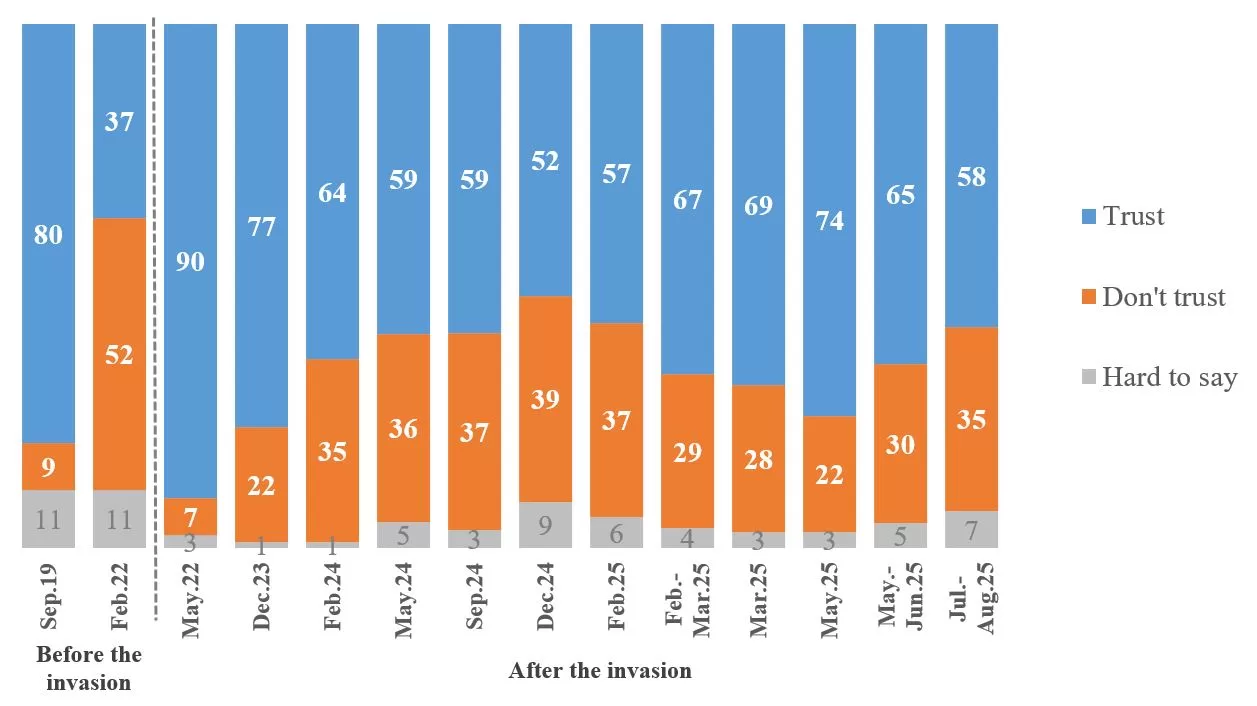 According to KIIS, 58% of respondents currently trust the head of state, while 35% do not. For comparison, in June these figures were 65% and 30%, respectively. Despite this, the current level of trust is still higher than in December 2024, when the lowest value during the full-scale war was recorded (52% versus 39%).