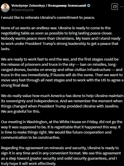 “None of us wants an endless war. Ukraine is ready to sit down at the negotiating table as soon as possible to bring a lasting peace closer. No one wants peace more than Ukrainians. My team and I are ready to work under the strong leadership of President Trump to achieve a lasting peace,” the statement said.
