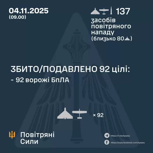 Станом на 9:00 протиповітряною обороною збито та подавлено 92 російські безпілотники різних типів на півночі, півдні та сході країни.