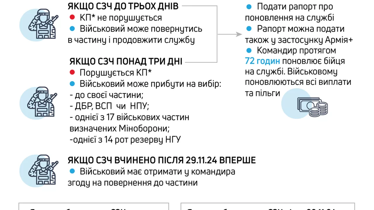 Цей механізм дає шанс тим, хто вчинив СЗЧ, повернутися до військової частини та продовжити службу в спрощеному порядку із поновленням грошового, продовольчого, речового та іншого забезпечення, — йдеться в повідомленні.