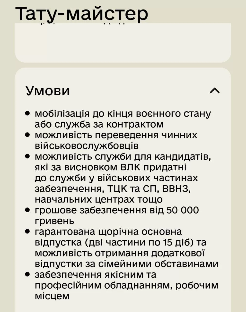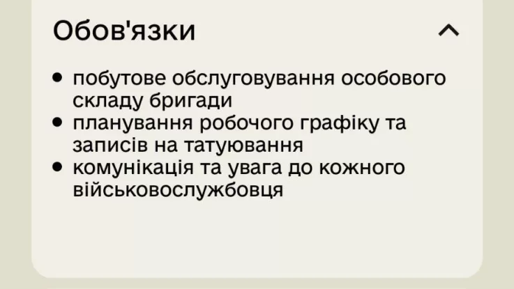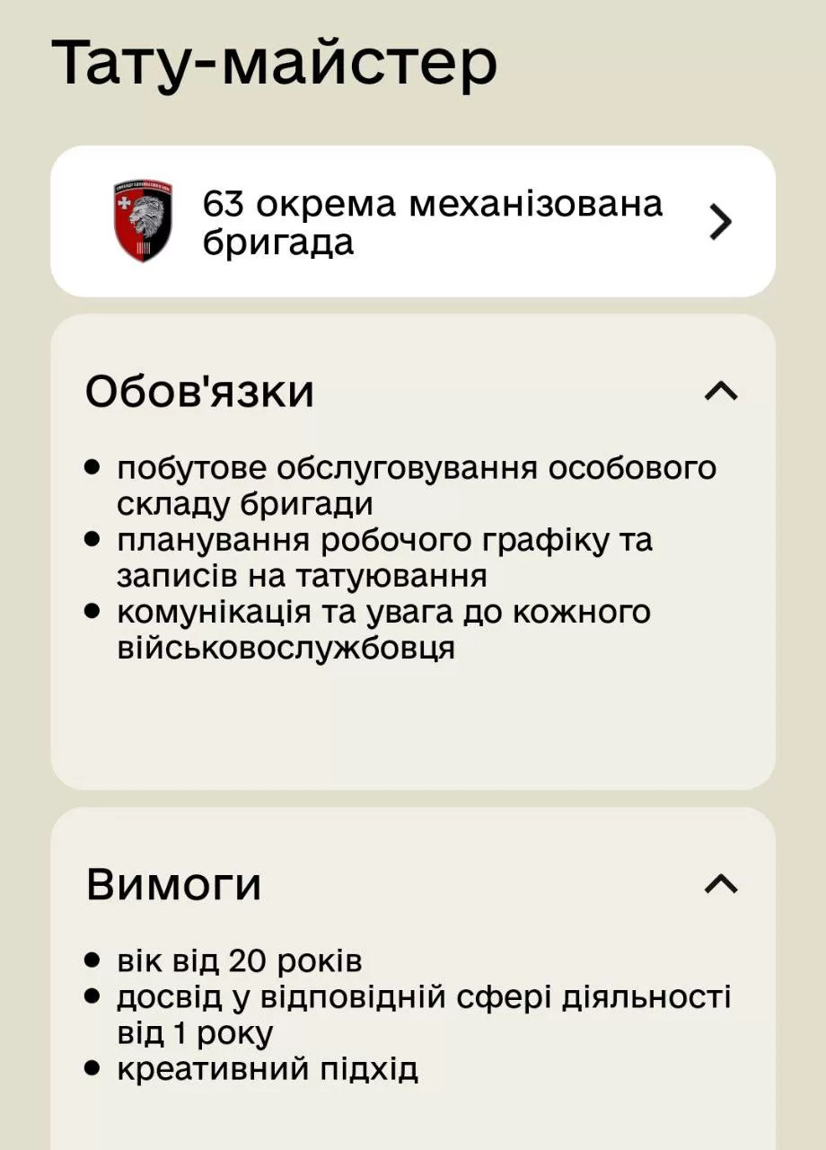 63 окрема механізована бригада опублікувала вакансію тату-майстра “для побутового обслуговування особового складу”. У бригаді зазначили, що це частина зусиль із покращення умов для особового складу.