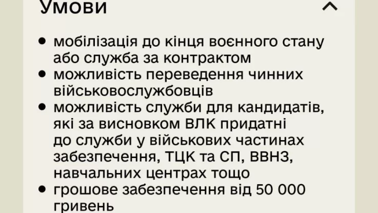 В першу чергу ці вакансії – для ветеранів війни з бойовим досвідом, а також для кандидатів, які мають обмеження по стану здоров’я і придатні для військової служби лише в тилових підрозділах. Важливий також досвід роботи у відповідній сфері”, – йдеться у повідомленні.