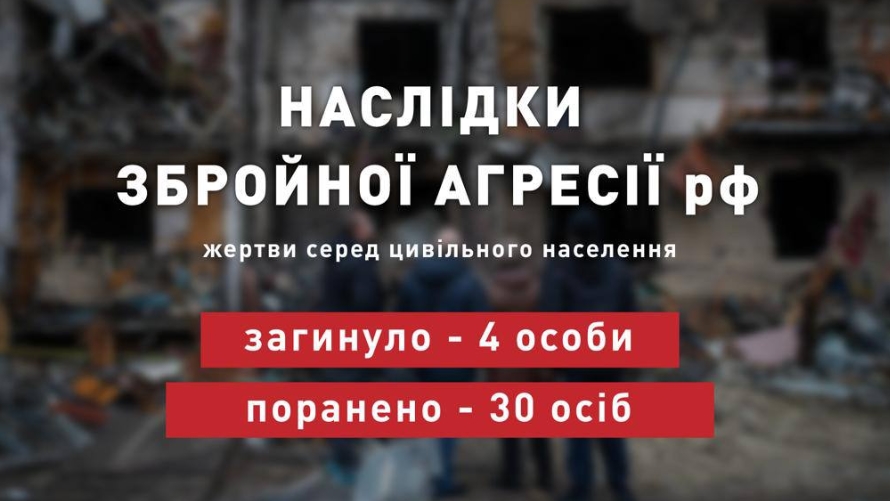 Російські військові минулої доби вбили в Україні 4 цивільних, ще 30 осіб зазнали поранень.