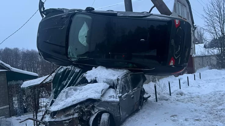 У Харківському районі сталася дорожньо-транспортна пригода, внаслідок якої один автомобіль опинився на іншому. Попри незвичні обставини аварії, ніхто з людей не постраждав.