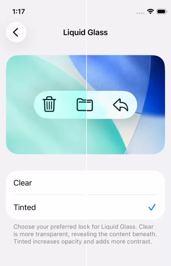 Серед головних нововведень — налаштування візуального стилю Liquid Glass, який дозволяє обрати між прозорим або тонованим виглядом елементів інтерфейсу для зручнішого читання.