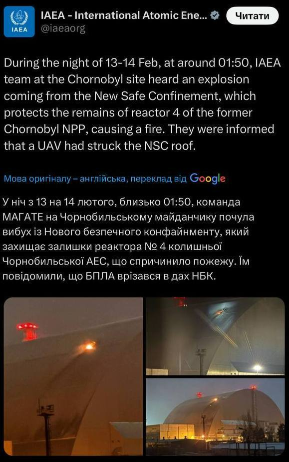 “14 лютого близько 1:50 команда МАГАТЕ на Чорнобильському майданчику почула вибух з боку Нового безпечного конфайнмента, який захищає залишки 4-го реактора колишньої Чорнобильської АЕС, що спричинив пожежу. Їм повідомили, що в дах НБК влучив безпілотний літальний апарат”, – йдеться в повідомленні.