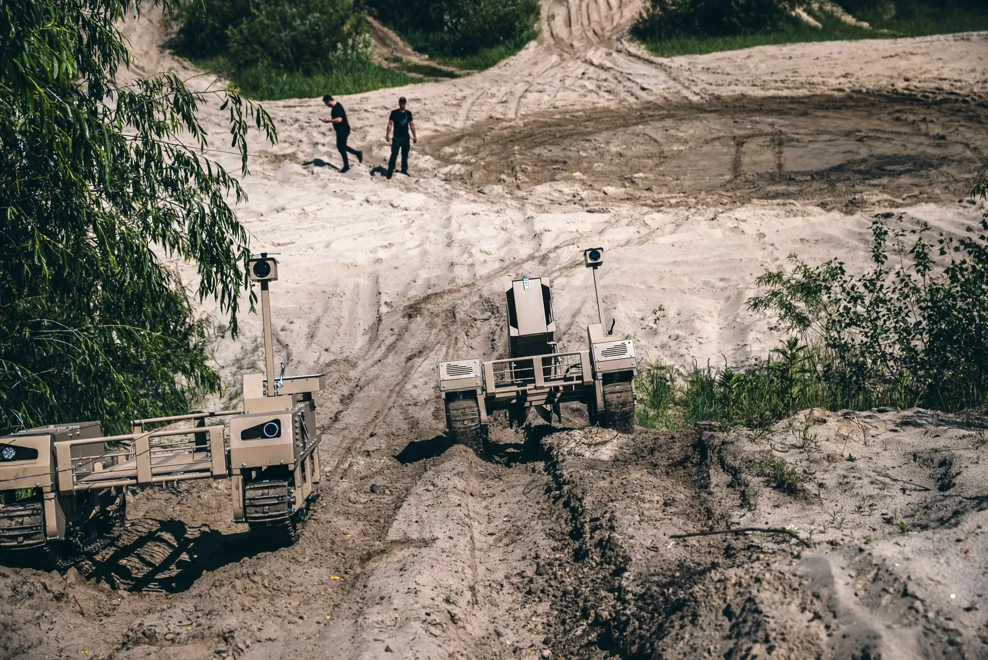 У лісистих дюнах на березі Дніпра під Києвом два приземкуваті безпілотні апарати, схожі на механізованих крабів, спускаються по рампі на пісок. За розмірами вони як візок із супермаркету, тільки удвічі ширші й важать 280 кілограмів. Людина керує ними дистанційно: гусениці легко долають піщану місцевість, пише Bloomberg.
