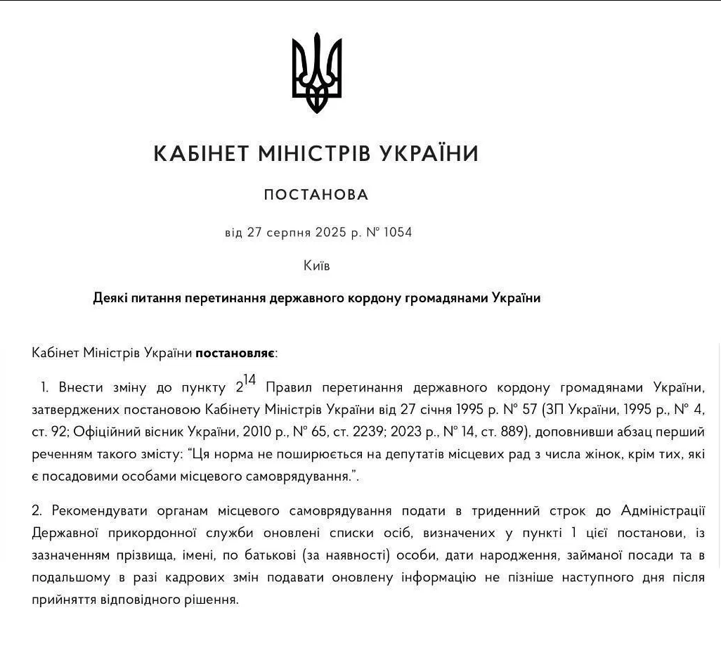 Згідно з документом, заборона на перетин державного кордону України більше не стосується жінок-депутатів місцевих рад, за винятком тих, хто обіймає посади в органах місцевого самоврядування.