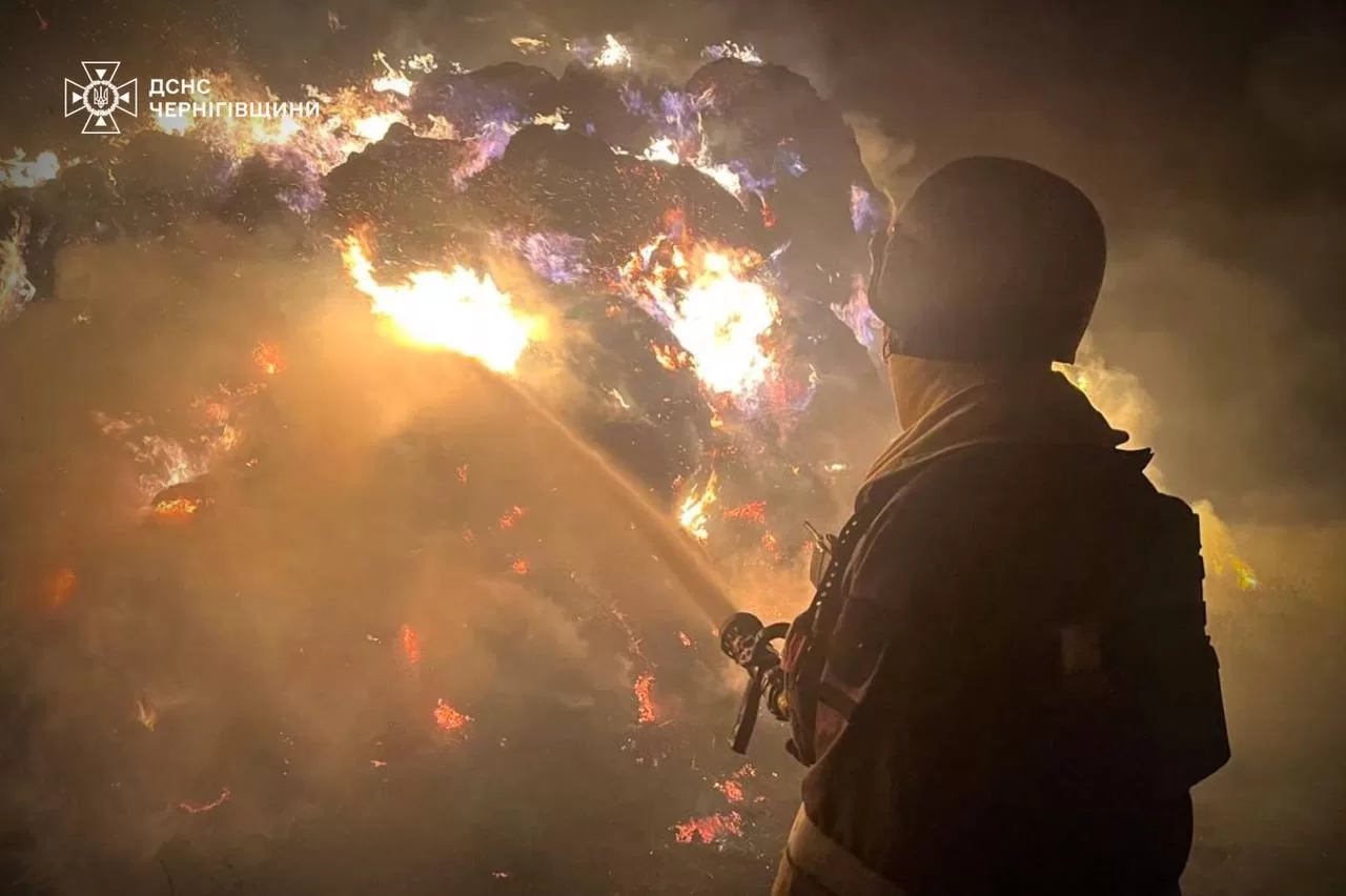 Корюківський район: у результаті влучання по території фермерського господарства загорілися скирди соломи на загальній площі близько 1800 кв. м. До ліквідації пожежі залучалися підрозділи ДСНС та місцева пожежна команда. Пожежу ліквідовано.