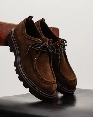 Головна особливість дербі — відкрита шнурівка, яка робить взуття більш універсальним і зручним. Завдяки цій конструкції туфлі легше адаптуються до різної повноти стопи та не створюють відчуття жорсткості, характерного для деяких класичних моделей.
