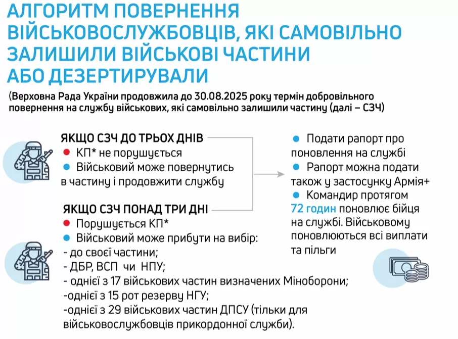 В Україні діє механізм добровільного повернення військовослужбовців, які самовільно залишили частини або вчинили дезертирство. Ті, хто встигнуть зробити це до 30 серпня, можуть уникнути кримінальної відповідальності й поновитися на службі.