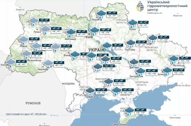 Завтра погода в Україні буде переважно хмарною. На заході країни очікуються невеликі дощі, тоді як на решті території — помірні. Значні опади прогнозуються в Одеській, Миколаївській, Кіровоградській, Дніпропетровській, Полтавській і Харківській областях.