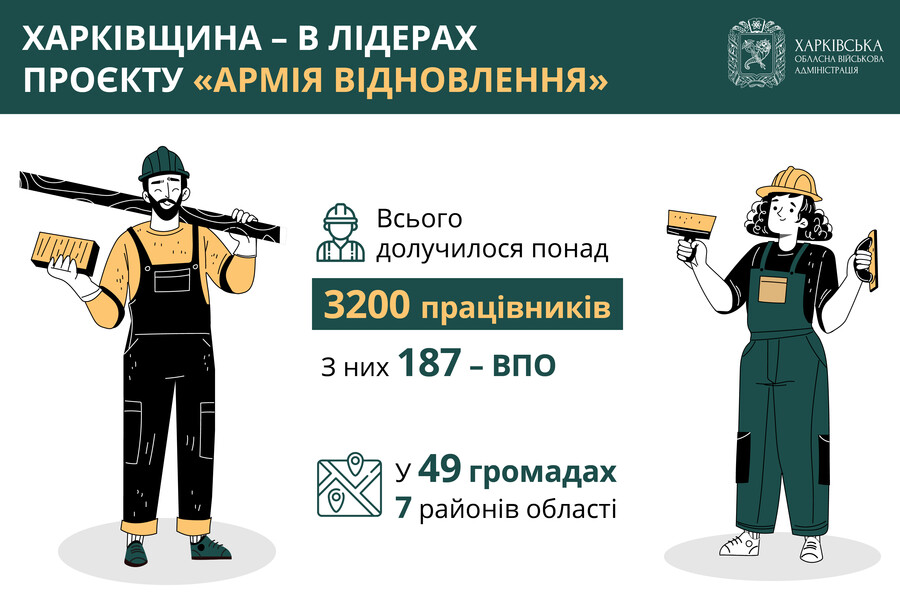 Лише за останній тиждень до програми «Армія відновлення» на Харківщині долучилися майже 1200 осіб. Загалом суспільно корисні роботи виконують 3200 людей, серед яких 187 ВПО.