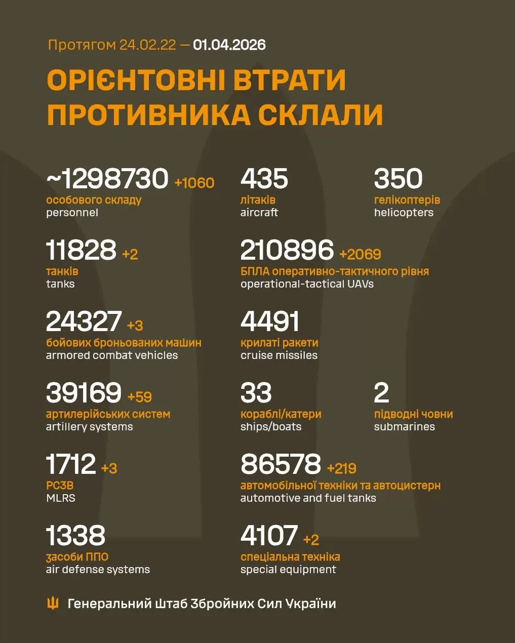 Загальні бойові втрати противника з 24 лютого 2022 року по 1 квітня 2026 року орієнтовно склали близько 1 298 730 осіб, з них 1 060 — за минулу добу. Також знищено 11 828 танків (+2), 24 327 бойових броньованих машин (+3), 39 169 артилерійських систем (+59) та 1 712 реактивних систем залпового вогню (+3).