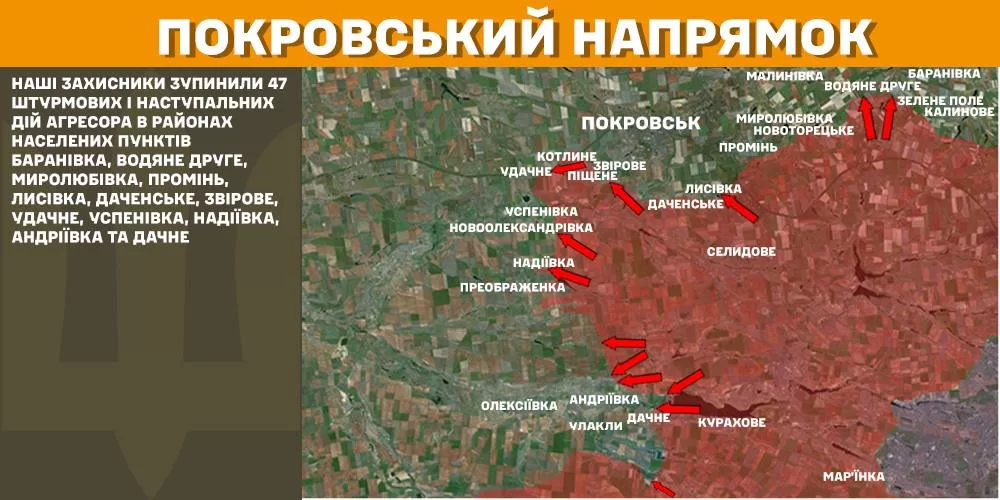 На Покровському напрямку українські захисники зупинили 47 штурмових і наступальних дій агресора в районах населених пунктів Баранівка, Водяне Друге, Миролюбівка, Промінь, Лисівка, Даченське, Звірове, Удачне, Успенівка, Надіївка, Андріївка та Дачне.