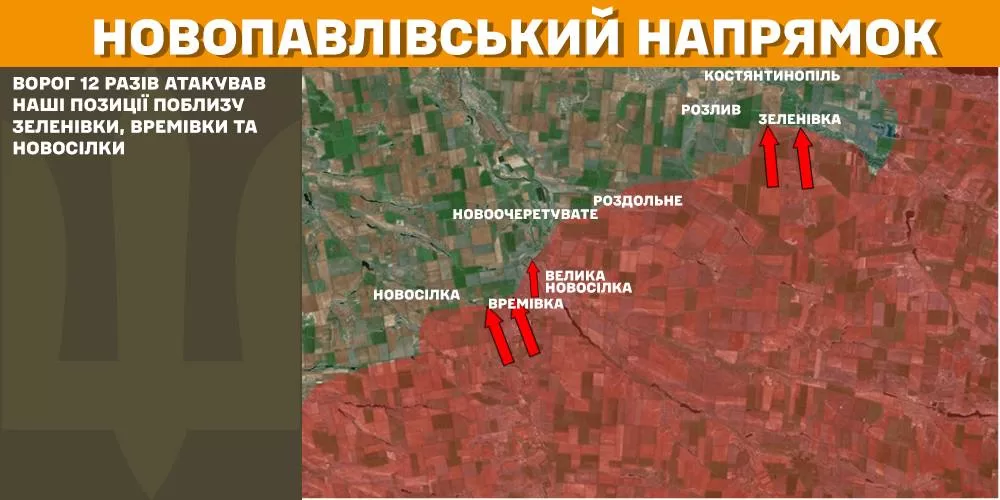 На Новопавлівському напрямку ворог 12 разів атакував позиції ЗСУ поблизу Зеленівки, Времівки та Новосілки.