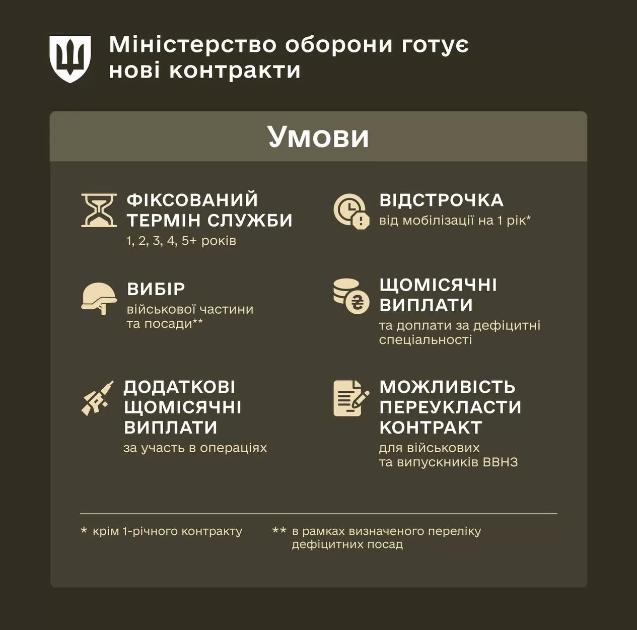 Головна новація – встановлення чітких термінів служби. Контракти планують запровадити строком від одного до п’яти років. Для тих, хто укладе контракт на два чи більше років, після завершення служби передбачатиметься річна відстрочка від мобілізації.