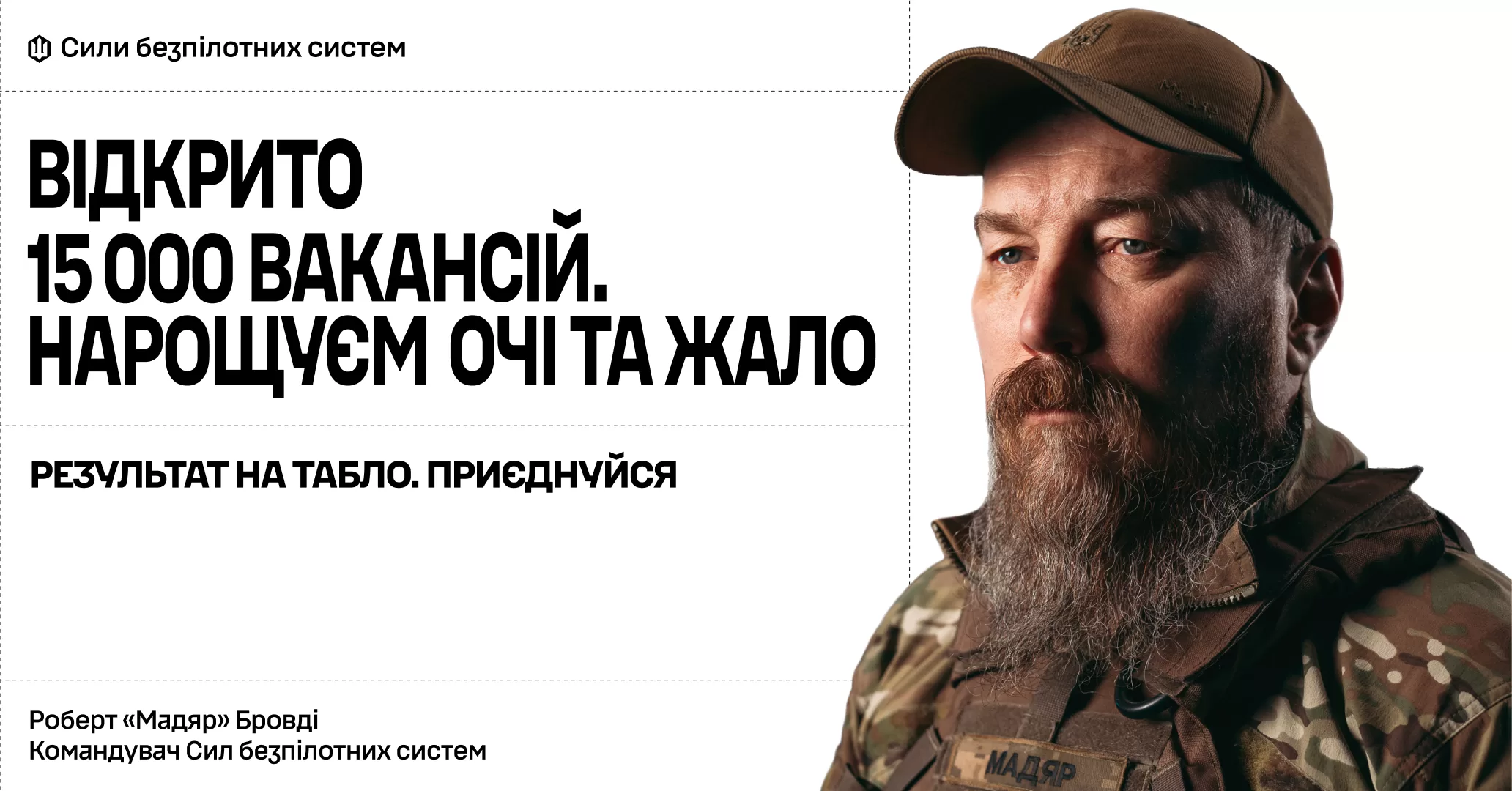 Командувач Сил безпілотних систем Роберт «Мадяр» Бровді у новому відео представив набір до СБС у стилі кінорежисера, оголосивши пошук «операторів вибухових блокбастерів». У межах рекрутингу відкрито 15 тисяч вакансій для роботи з дронами та забезпечення підрозділу.