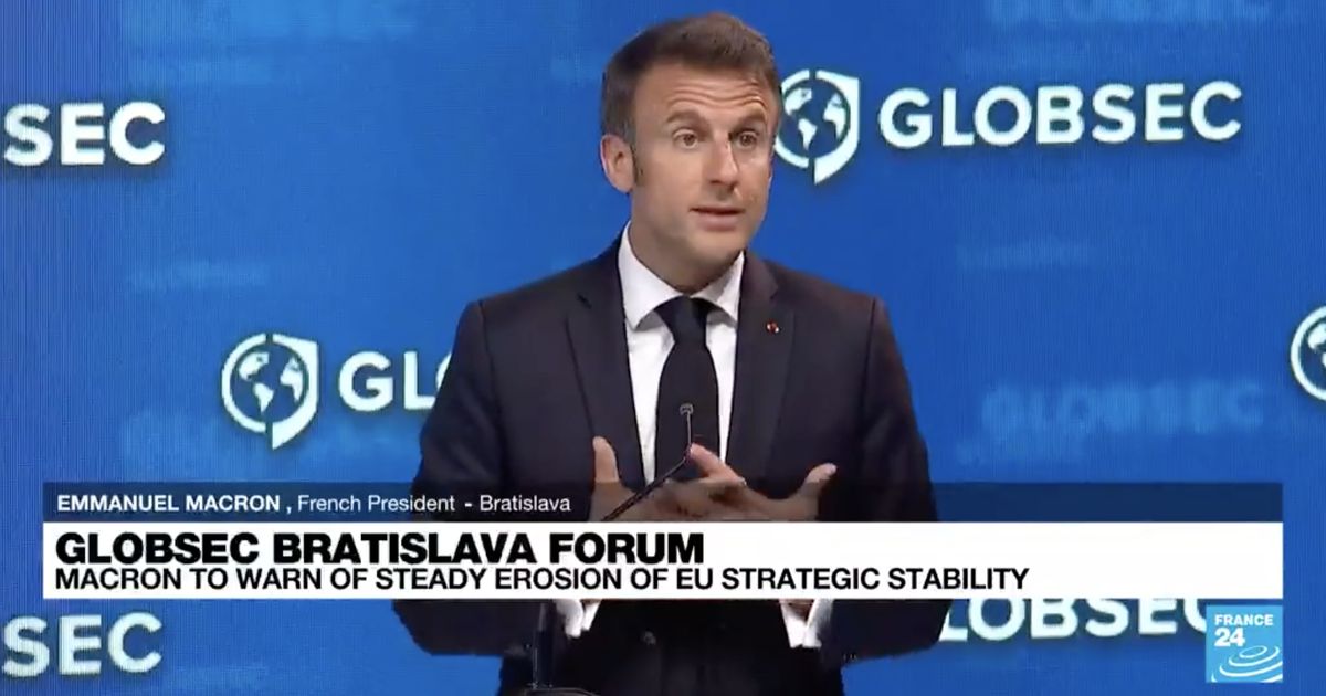 🔴 "What is at stake today is not only a European affair, but a threat to global security and peace," says #Macron at the #GLOBSEC forum about the #warinUkraine.