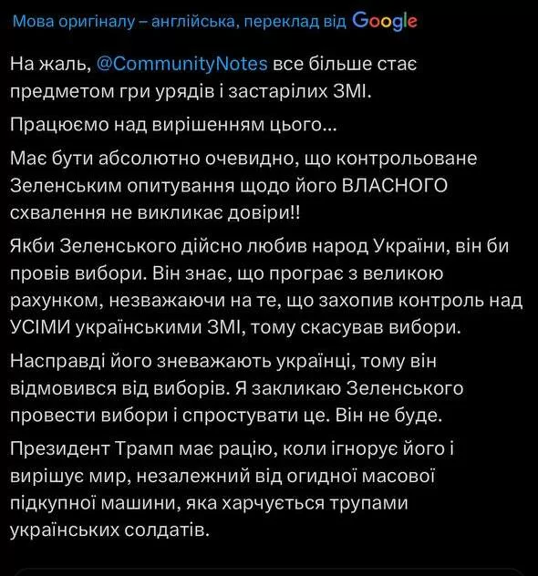 Американський мільярдер і союзник Дональда Трампа знову розкритикував президента України, звинувативши його у небажанні проводити вибори. Ілон Маск також поставив під сумнів рівень довіри до Зеленського, заявивши, що опитування нібито відбувалися під “контролем влади”.