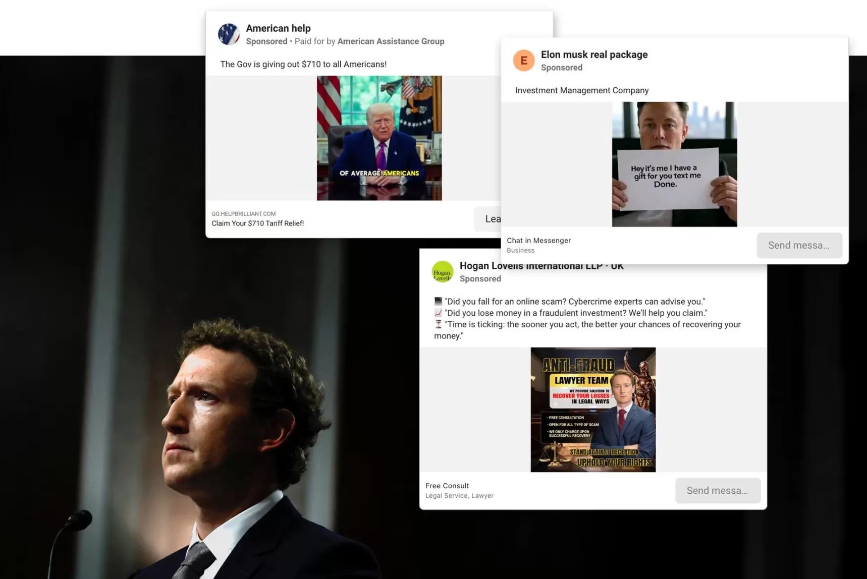 Генеральний директор Meta Марк Цукерберг свідчить перед Судовим комітетом Сенату США у січні 2024 року / Скріншоти реклами – Reuters. Фото Цукерберга: REUTERS/Evelyn Hockstein