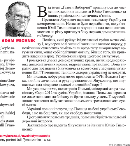 Самая влиятельная польская "Газета Выборча" опубликовала сегодня письмо главного редактора издания, польского журналиста номер 1 Адама Михника, в котором автор обращается к Президенту Украины Януковичу с просьбой не компрометировать Украину и выпустить на свободу Юлию Тимошенко. Сканы статьи разместил в своем блоге на "Украиской правде" генеральный директор канал ТВi Николай Княжицкий.