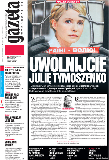 Обращение Адама Михника было опубликовано на первой странице сегодняшнего номера с большой фотографией Юлии Тимошенко.