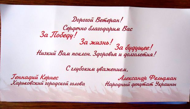 К набору прилагается две открытки, в которых Фельдман и Кернес поздравляют ветеранов с 9 мая, а также призывают их, в частности, к возрождению промышленности, науки и социальной справедливости.