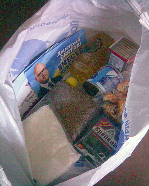 Народный депутат от Партии регионов Дмитрий святаш раздает в Харькове продуктовые наборы со своей фотографией.