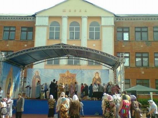 На сцене выставлена Почаевская икона Божьей матери, к которой идут паломники.