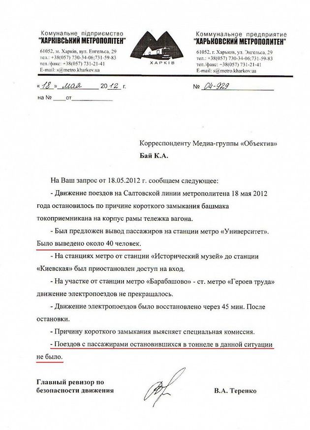 В распоряжение Медиапорта попал документ, подписанный главным ревизором по безопасности движения Харьковского метрополитена В.Теренко. Из документа следует: поездов, остановившихся в тоннеле, в этой ситуации не было. А пассажиров вывели на станции метро «Университет». Всего — около 40 человек.