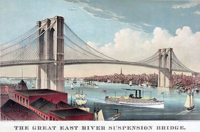 В 1883 году в Нью-Йорке открыт Бруклинский мост - один из старейших висячих мостов в США, его длина составляет 1825 метров, он пересекает пролив Ист-Ривер и соединяет Бруклин и Манхэттен в городе Нью-Йорк. На момент окончания строительства он являлся самым большим подвесным мостом в мире и первым мостом, в конструкции которого использовались стальные прутья. Мост построен из известняка, гранита и цемента Розендаля.. Первоначальное название — Мост Нью-Йорка и Бруклина. С 1915 года за мостом официально было закреплено настоящее название.
